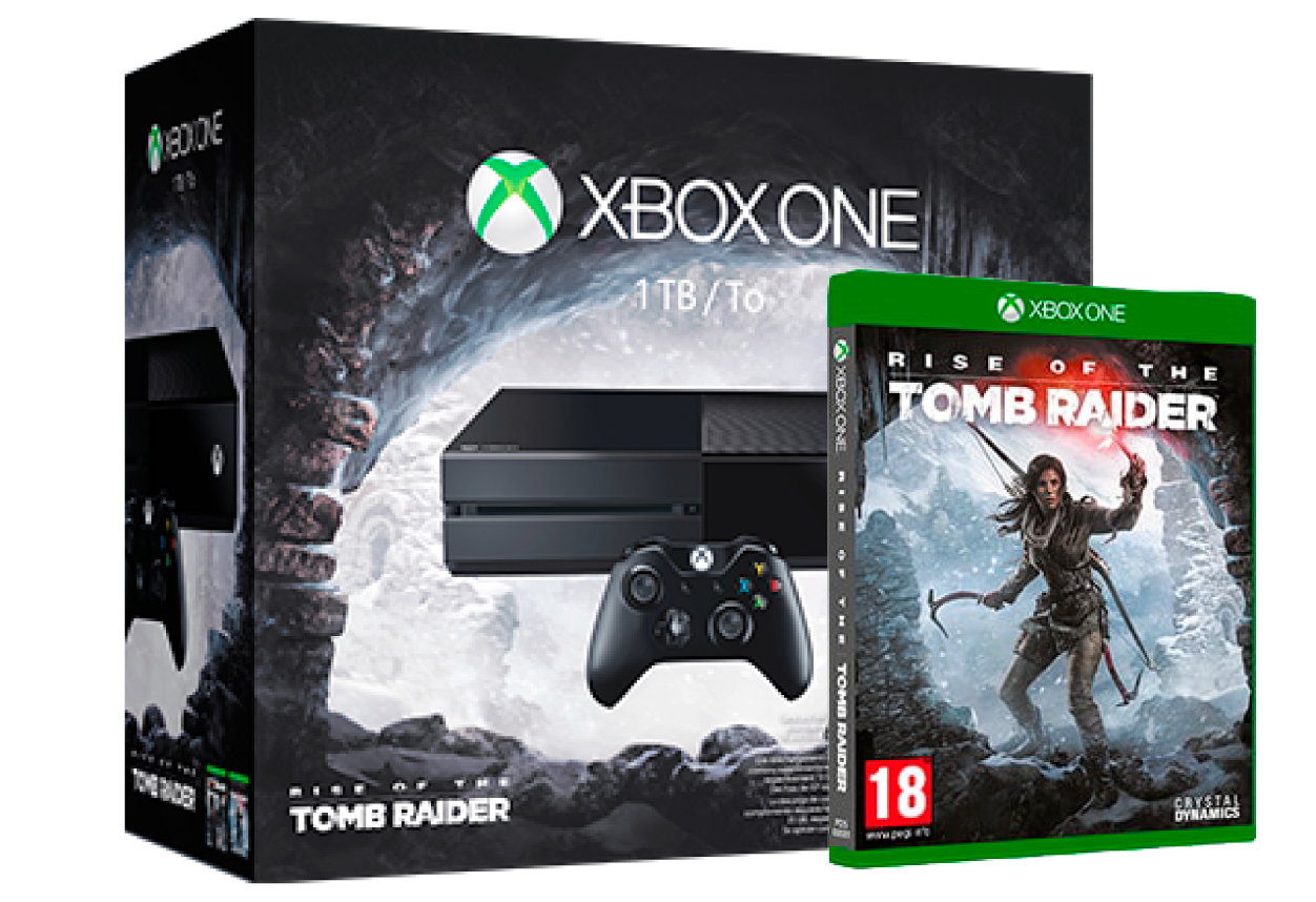 Consola Xbox One, Rise of the Tomb Raider, el cual contiene las versiones digitales de los juegos Rise of the Tomb Raider —una exclusiva de Xbox que llegará a finales de 2015—, Tomb Raider: Definitive Editiony el kitde supervivencia táctico. Juega y almacena más títulos que nunca, incluyendo juegos de Xbox 360, en su disco duro de 1TB..